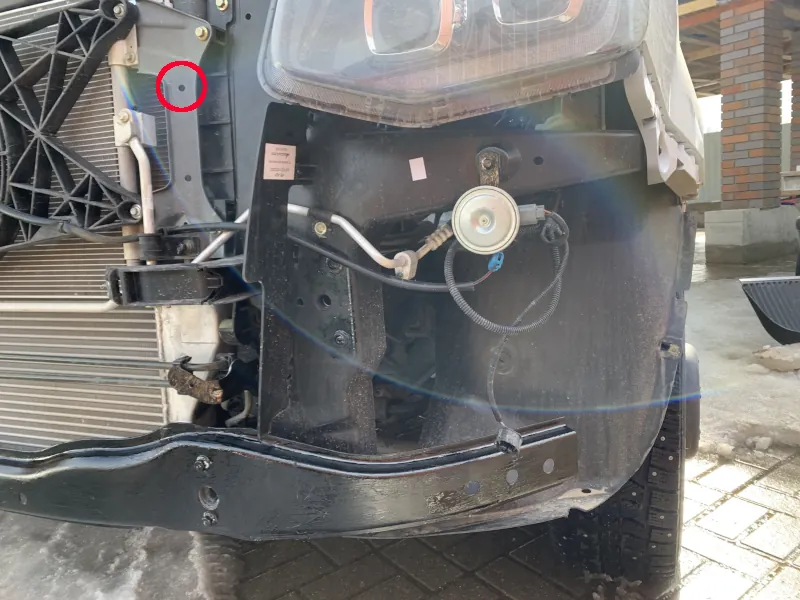 При установке силовых бамперов штатное место для датчика часто становится недоступным. В этом случае используют готовые отверстия на кронштейне радиаторов — это распространённое и практичное альтернативное решение.